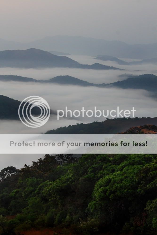 | Layers and layers of mountains in the far distance and only those who managed to rise high, rise above the clouds to enjoy the view. From inside it is nothing but blinding mist! Life's lessons taught with subtlety at Kodachadri during Sunset. |