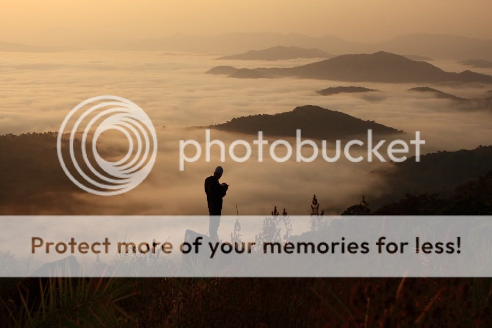 | I turned back a million times before I left. I was afraid the clouds might vanish in a split second. But they didn't, they stayed, until they left that is. But here in my mind, the clouds will be beneath my feet forever, Thank you Western Ghats, without you my life wouldn't be the same! Thank you for showing me the beauty that I never knew existed! Sunrise at Narasimha Parvatha. |